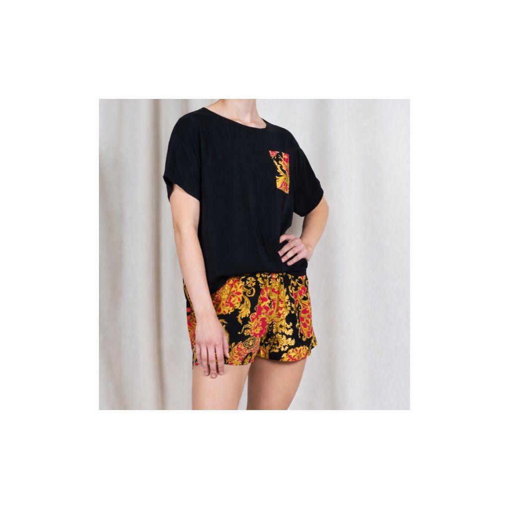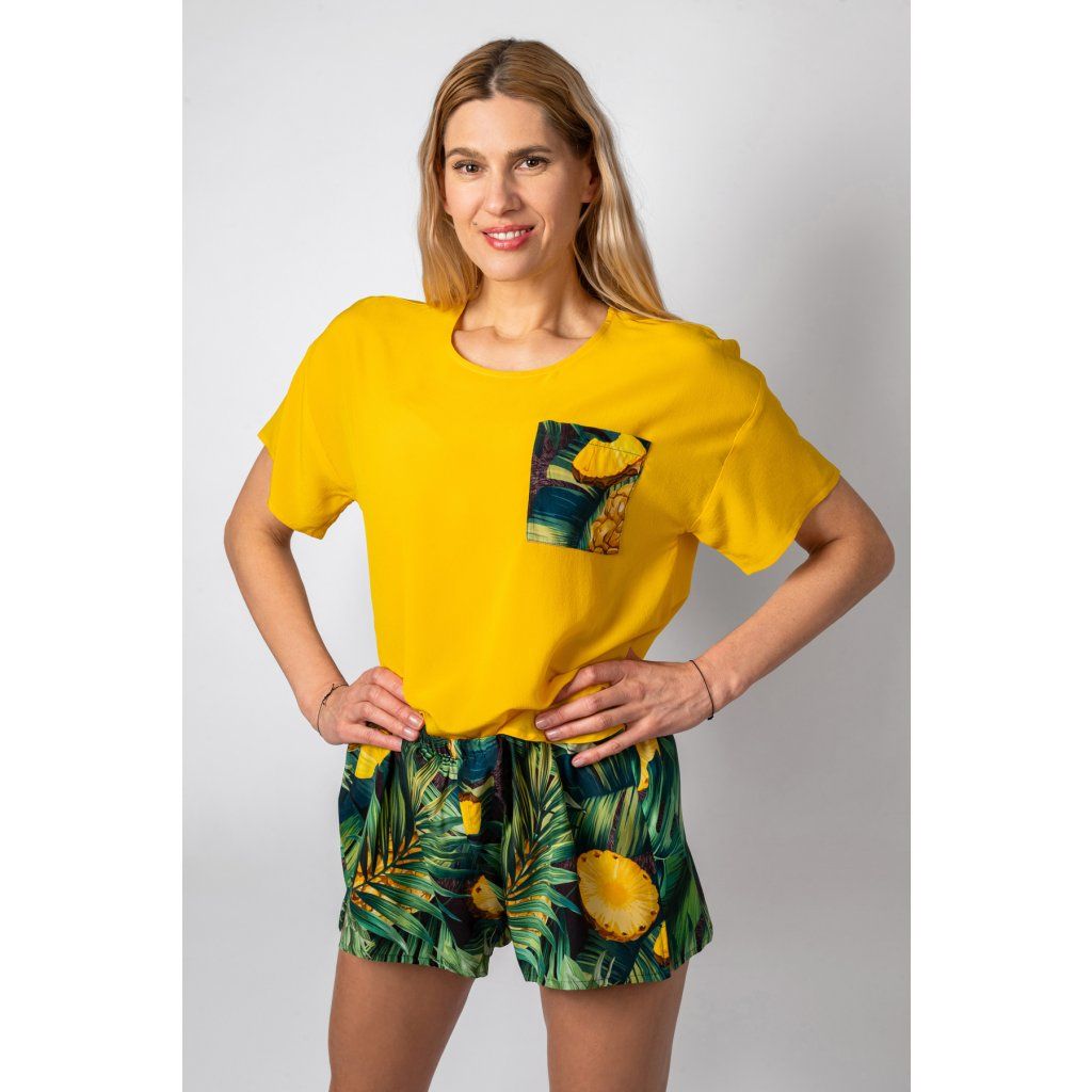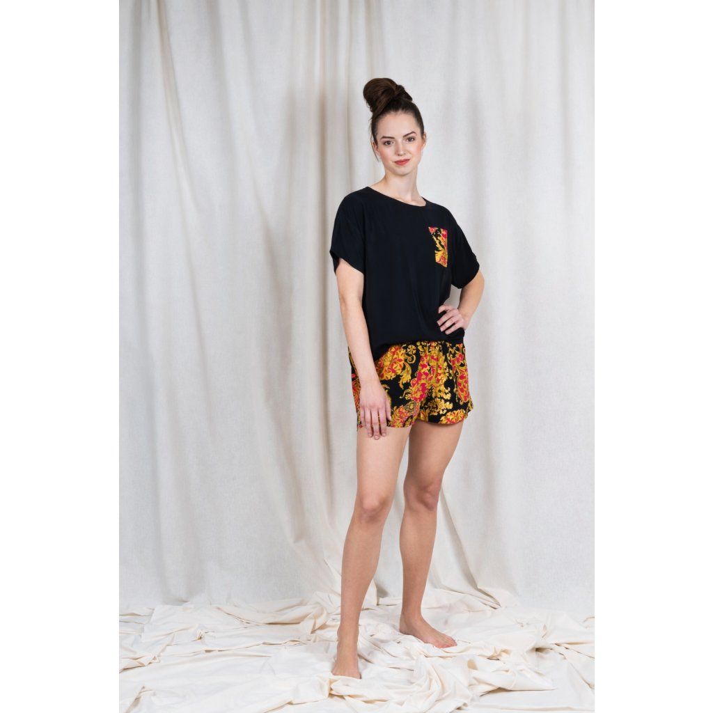 Hedvábné tričko s kapsičkou na hrudníku a kraťásky volného střihu.