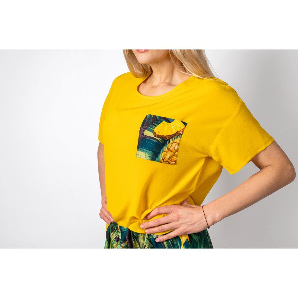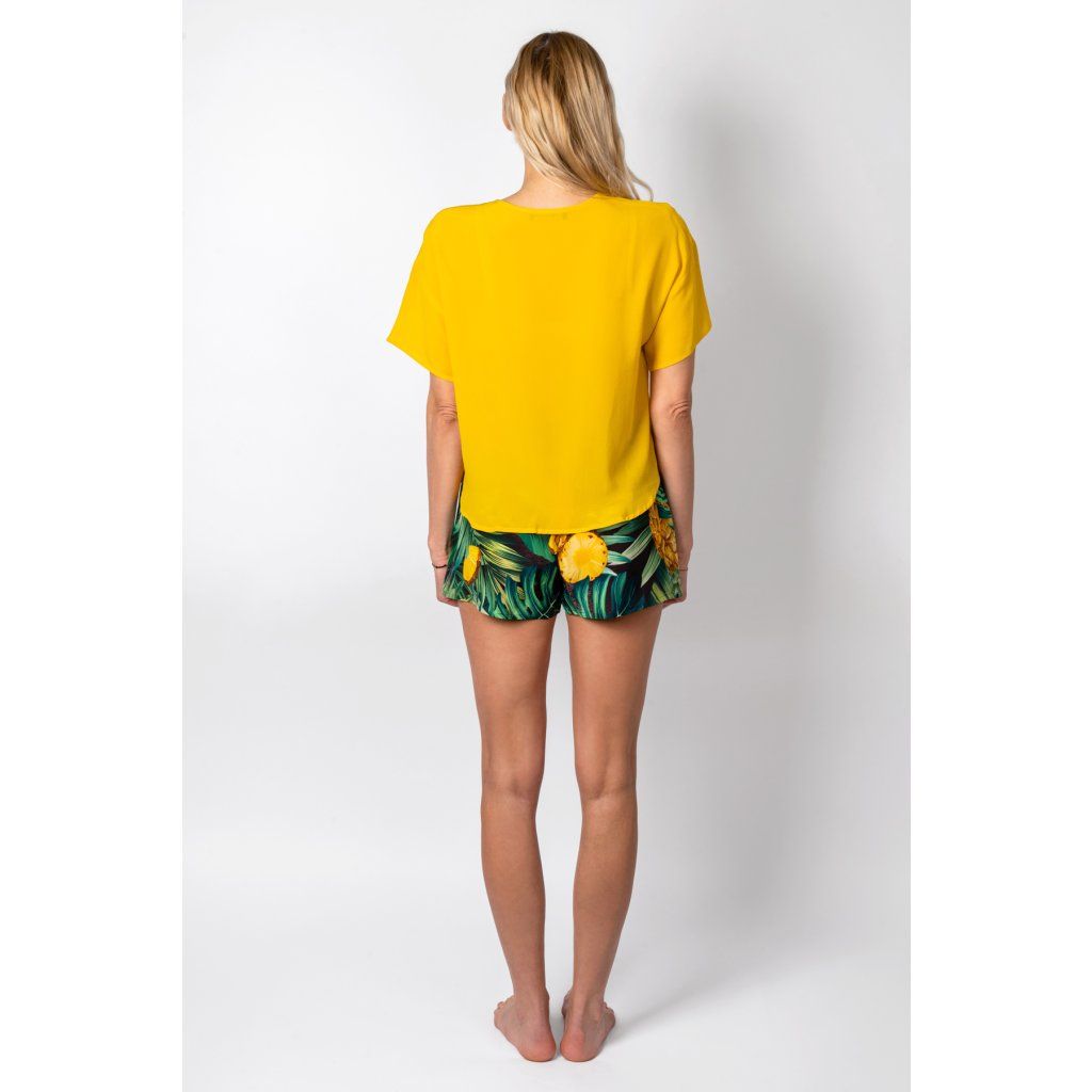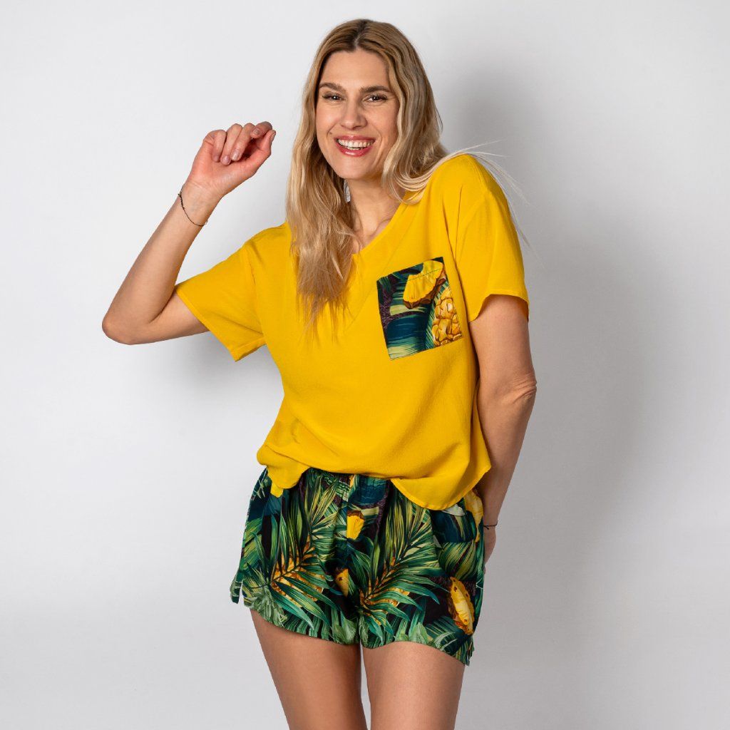 Hedvábné tričko s kapsičkou na hrudníku a kraťásky volného střihu.