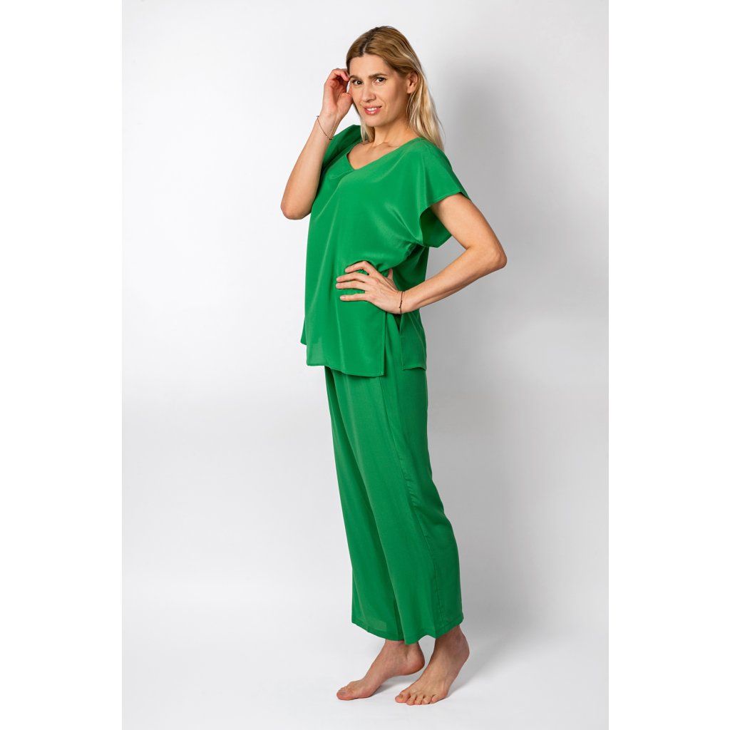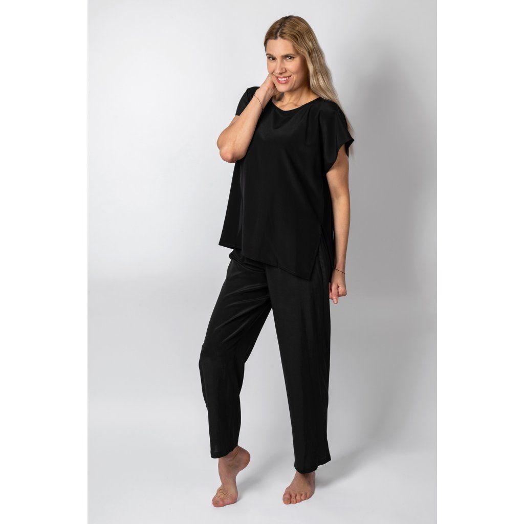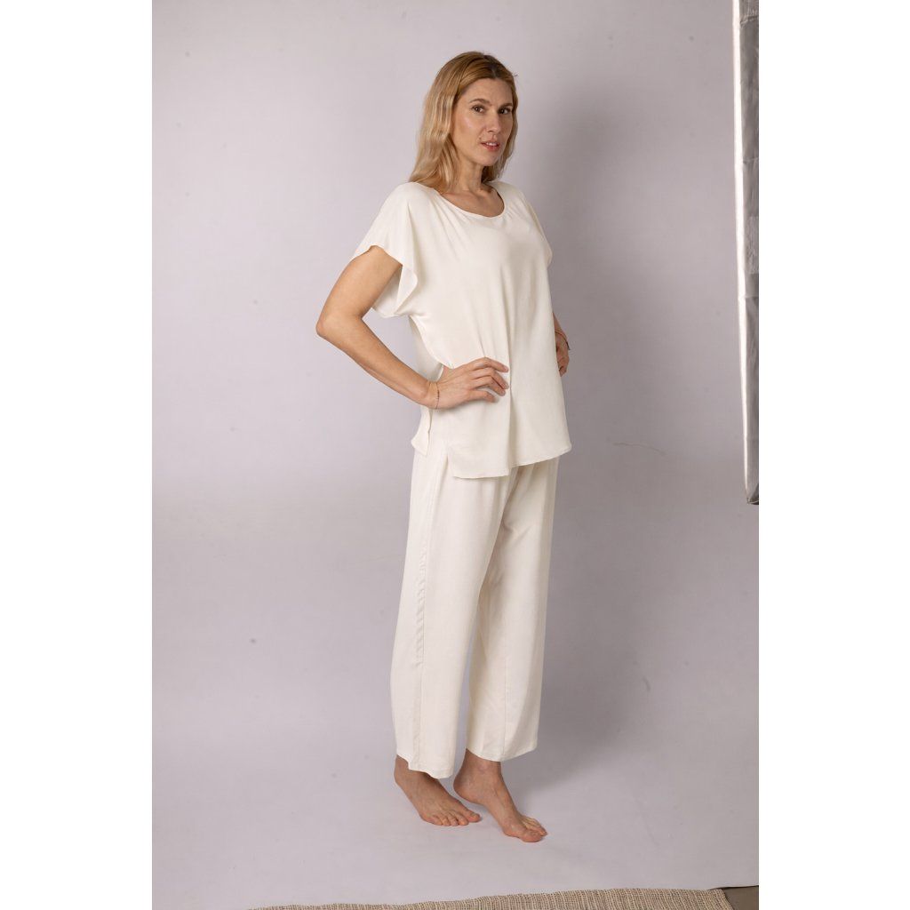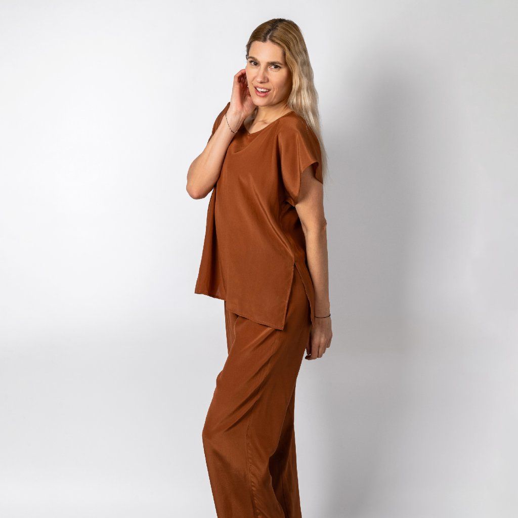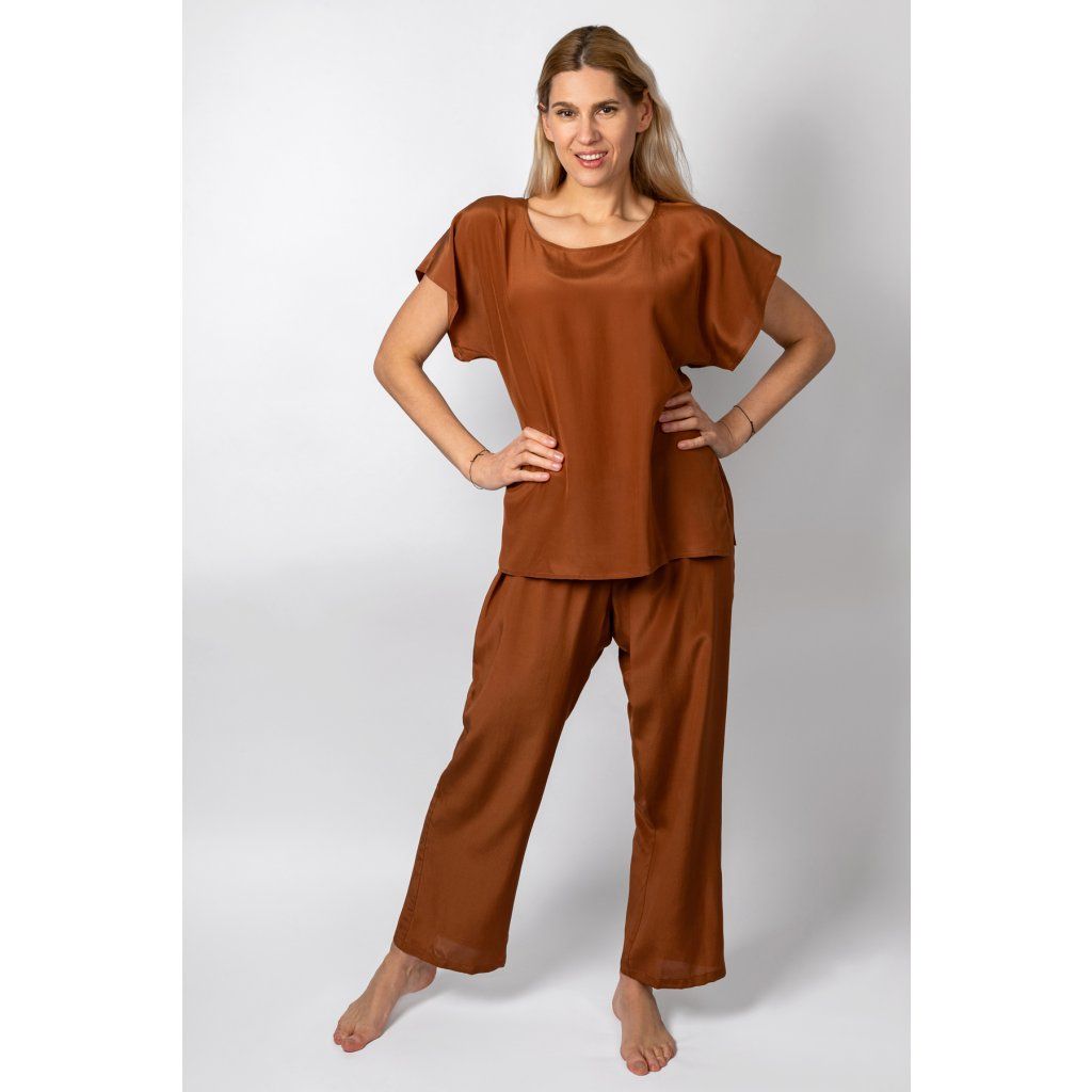 Hedvábný set s oversized tričkem a dlouhými kalhotami. Vyrobený ze 100% italského hedvábí. Volný, vzdušný a nadčasový – ideální pro pohodlné noci, dny i ležérní městský styl.