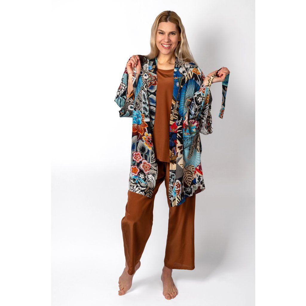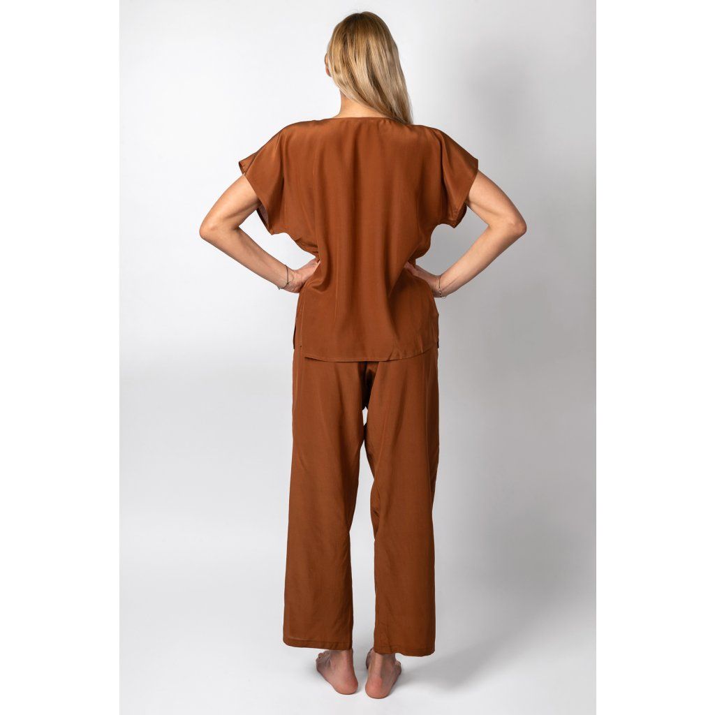 Hedvábné tričko je volné a prodyšné, má rozparky na bocích. Hedvábné kalhoty jsou volného střihu a mají gumu v pase.