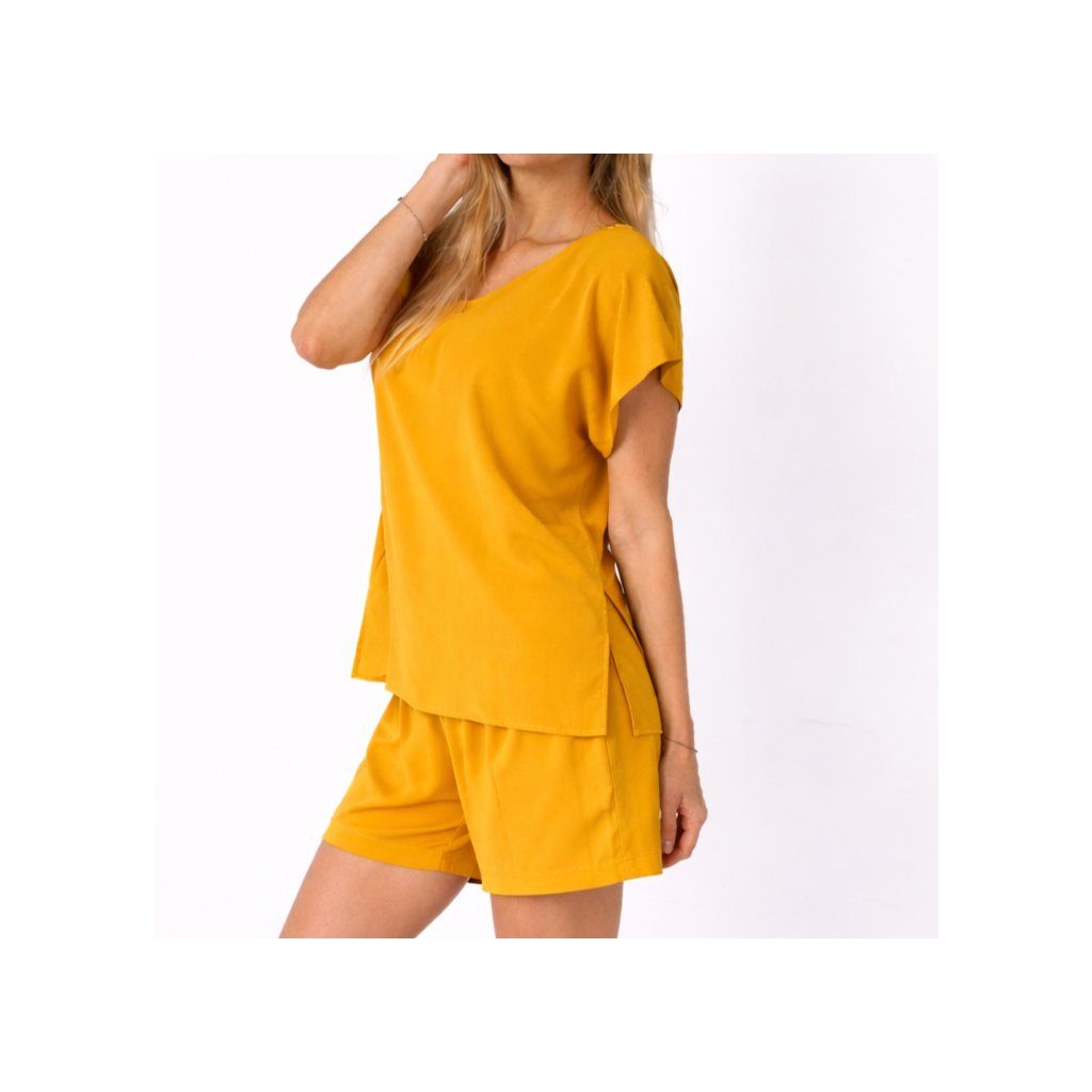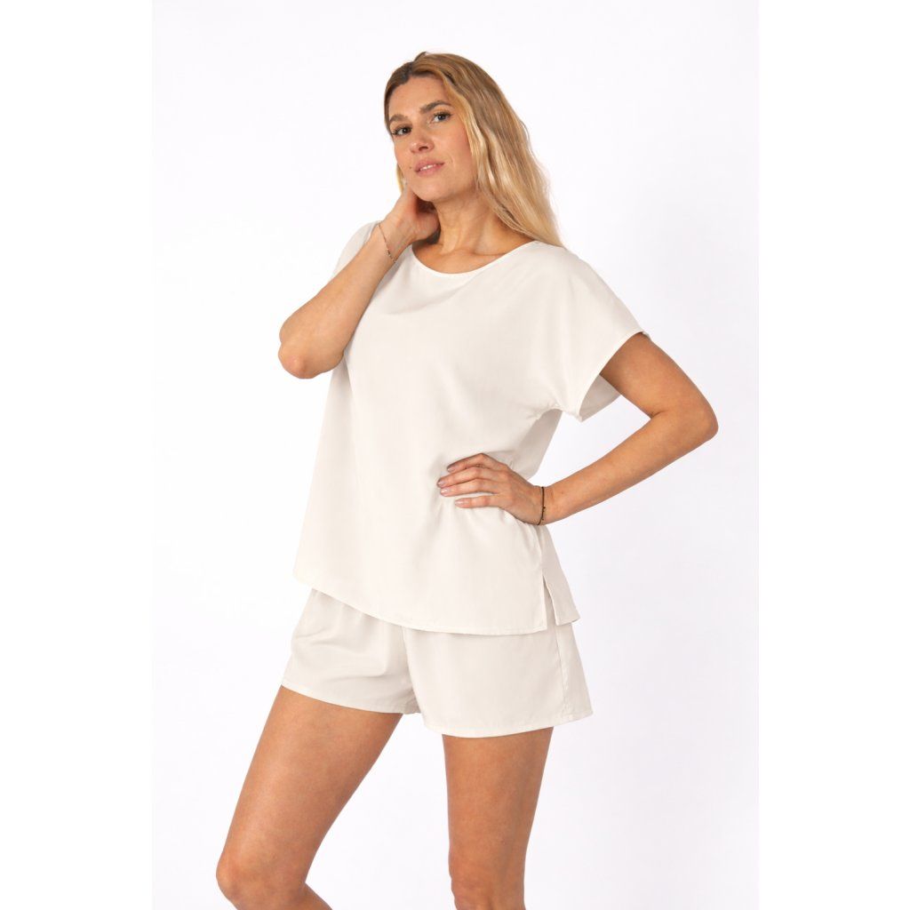 Tričko s volným střihem a jemně spadlými rameny vytváří nenucený a přitom promyšlený vzhled. Kraťásky s pružným pasem pohodlně sedí a zajišťují maximální komfort během spánku bez omezení pohybu. Tento komplet můžete využít především jako luxusní pyžamo, ale snadno ho vynesete i ven – stačí ho doplnit jednoduchými doplňky a obuví.