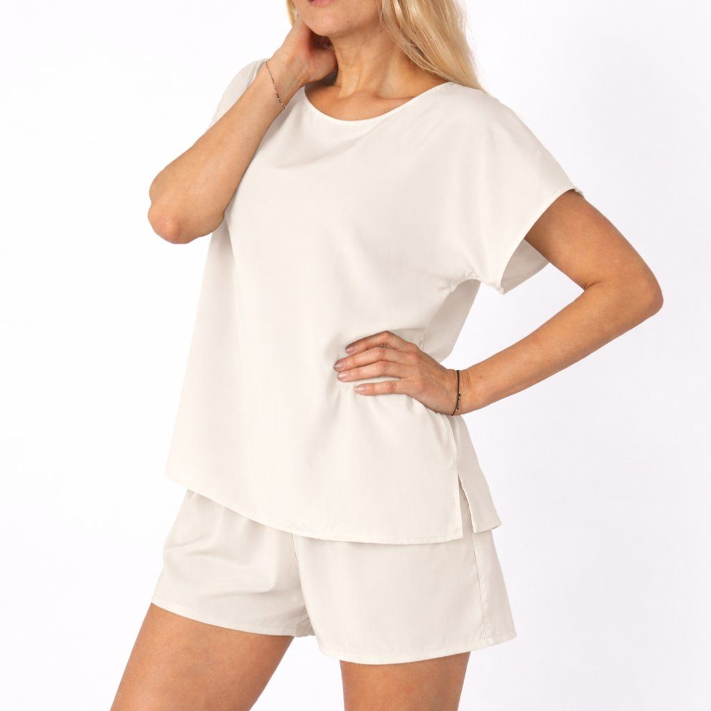 Hedvábné tričko je volné a prodyšné, má rozparky na bocích. Hedvábné kraťásky jsou volného střihu, mají gumu v pase a malé rozparky na bocích .